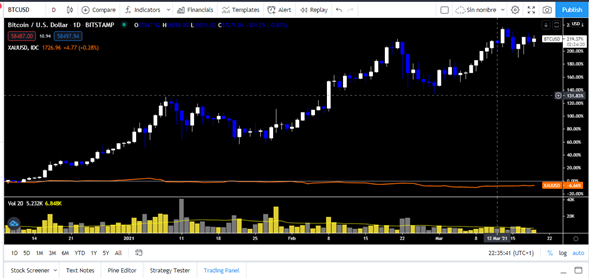This graph shows gold and bitcoin, where gold is the orange line, it can be seen that it has a small correlation with bitcoin, it is likely that it can make movements similar to bitcoin, some investors are concentrating much more on bitcoin and gold for the best diversification of their money, nobody wants to lose the value of money in case a crash occurs in the world market.