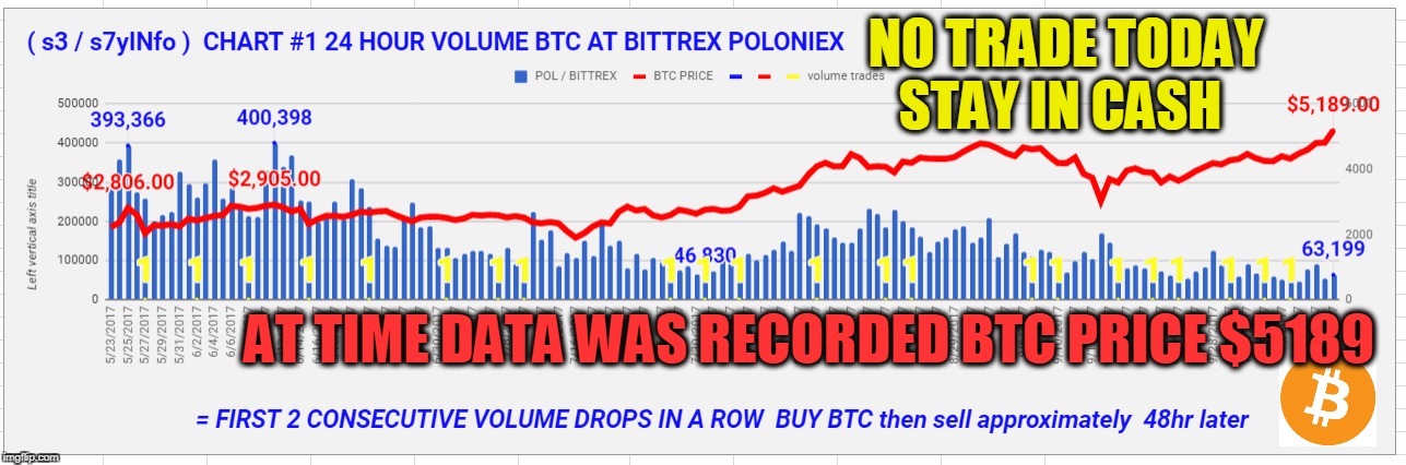 🐒 I may have isolated a possible chart pattern showing the possibility of Bitcoin rising in price . The pattern works like this when the first 2 consecutive days in a row the volume blue column falls ( they are marked with a YELLOW #1 ) When this occurred it is a signal to Buy Bitcoin and then Sell it approximately 48hrs later. Below are the results of using this Buy pattern.
