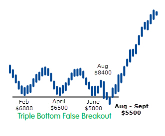" In fact, it is more likely that a quadruple bottom will be penetrated on the downside rather than the double bottom or the triple bottom, since the more times a particular area of support has held in the past, the more likely there will be a large accumulation of sell stops just under the lows. The inverse is true for quadruple top patterns."