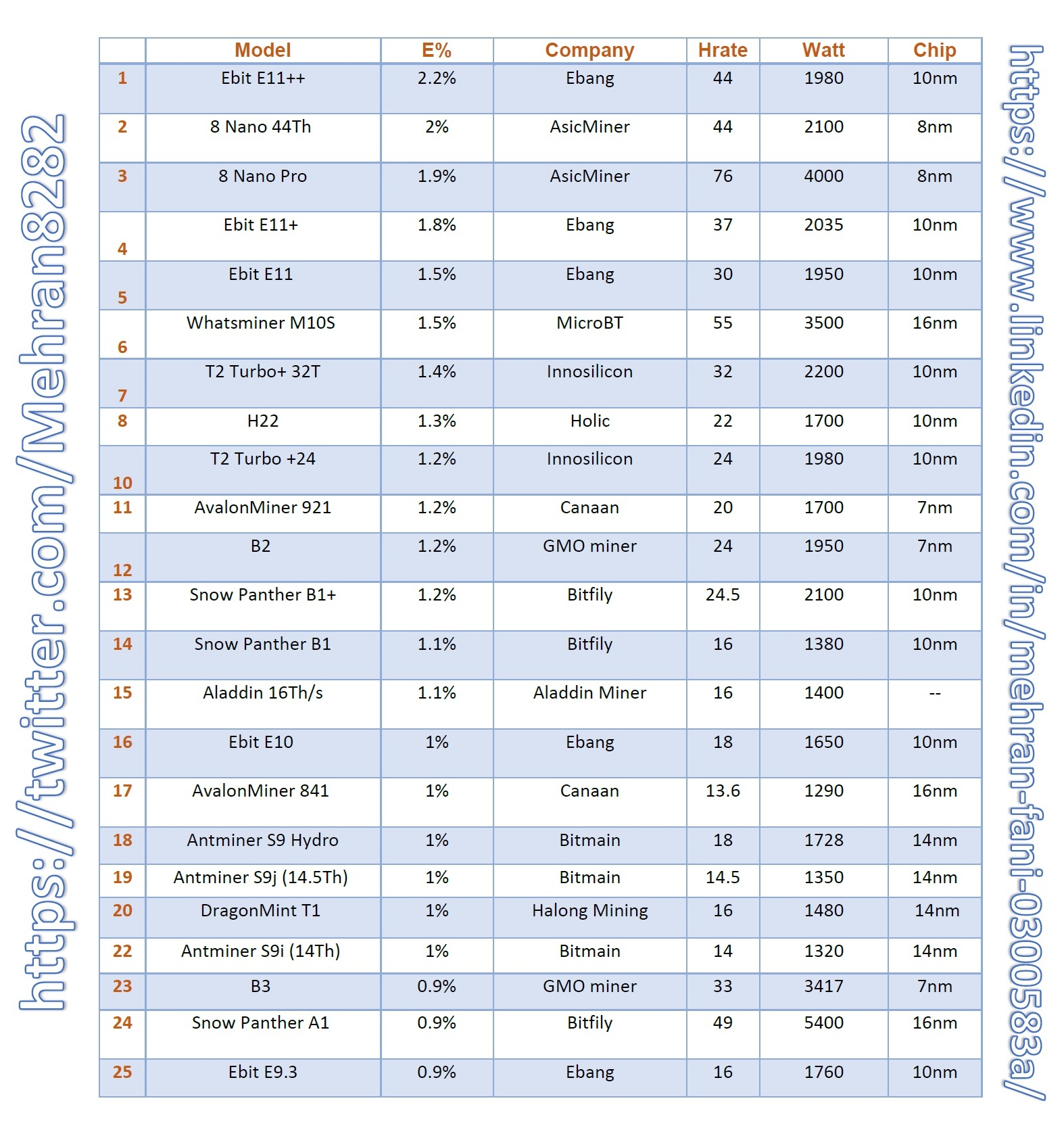 In the below table I have collected the necessary information regarding the current bitcoin mining hardware in the market: