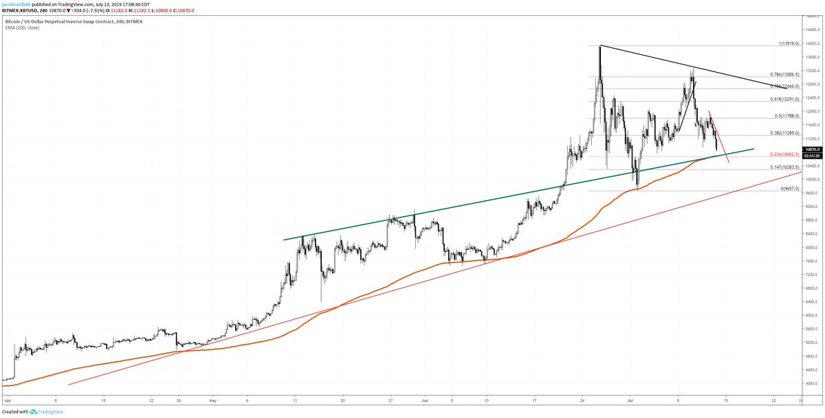 If the 200EMA breaks (on a closing candle), expect a deeper dive to the 50MA on the daily around $9900.