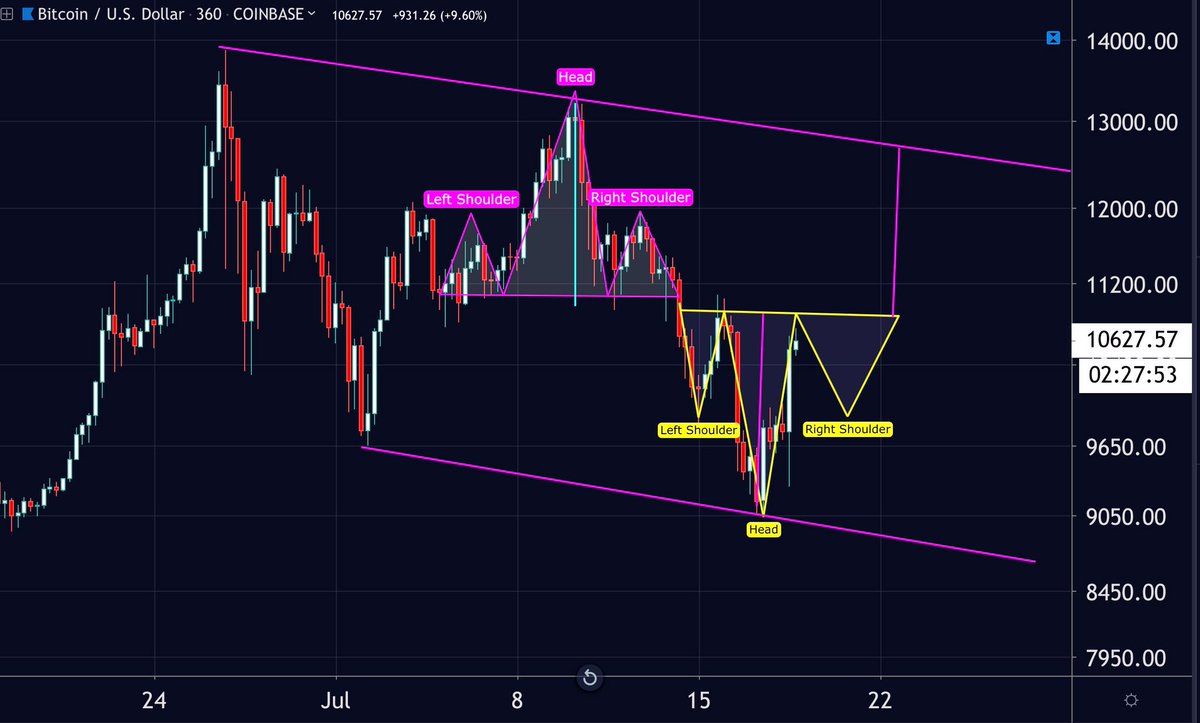 $BTC Since the H&S worked so well on the down side then maybe the invers H&S will work just as well on the upside where a measured move from the head to neck line would take #bitcoin up to the established resistance line...note the formation of the right shoulder tests $10K again