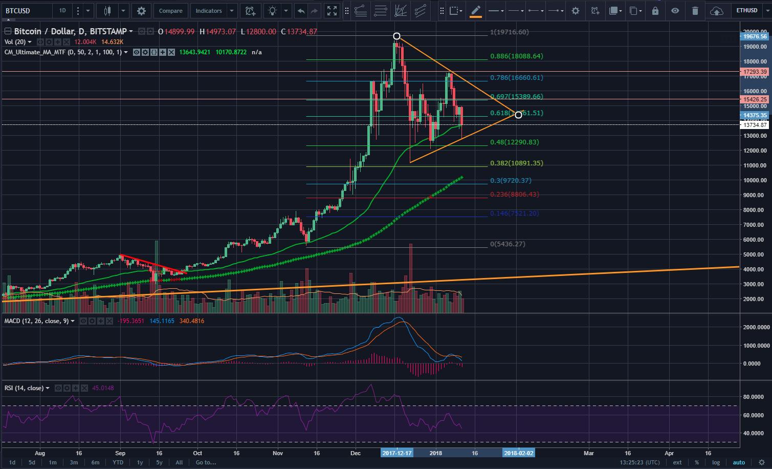 Bitcoin over the next week could climb up to test the upper line of the pennant before falling back down and testing the bottom line.