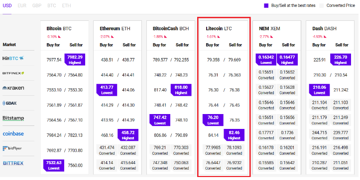 At the time of writing, among the exchanges followed by Cryptonesws.com, the lowest price to buy litecoin was at Bitstamp (USD 76.20), while Coinbase offered the highest price to sell litecoin (USD 82.46).
