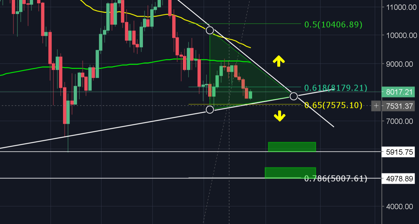 BTC breaks downwards out of the triangle -- LIKELY