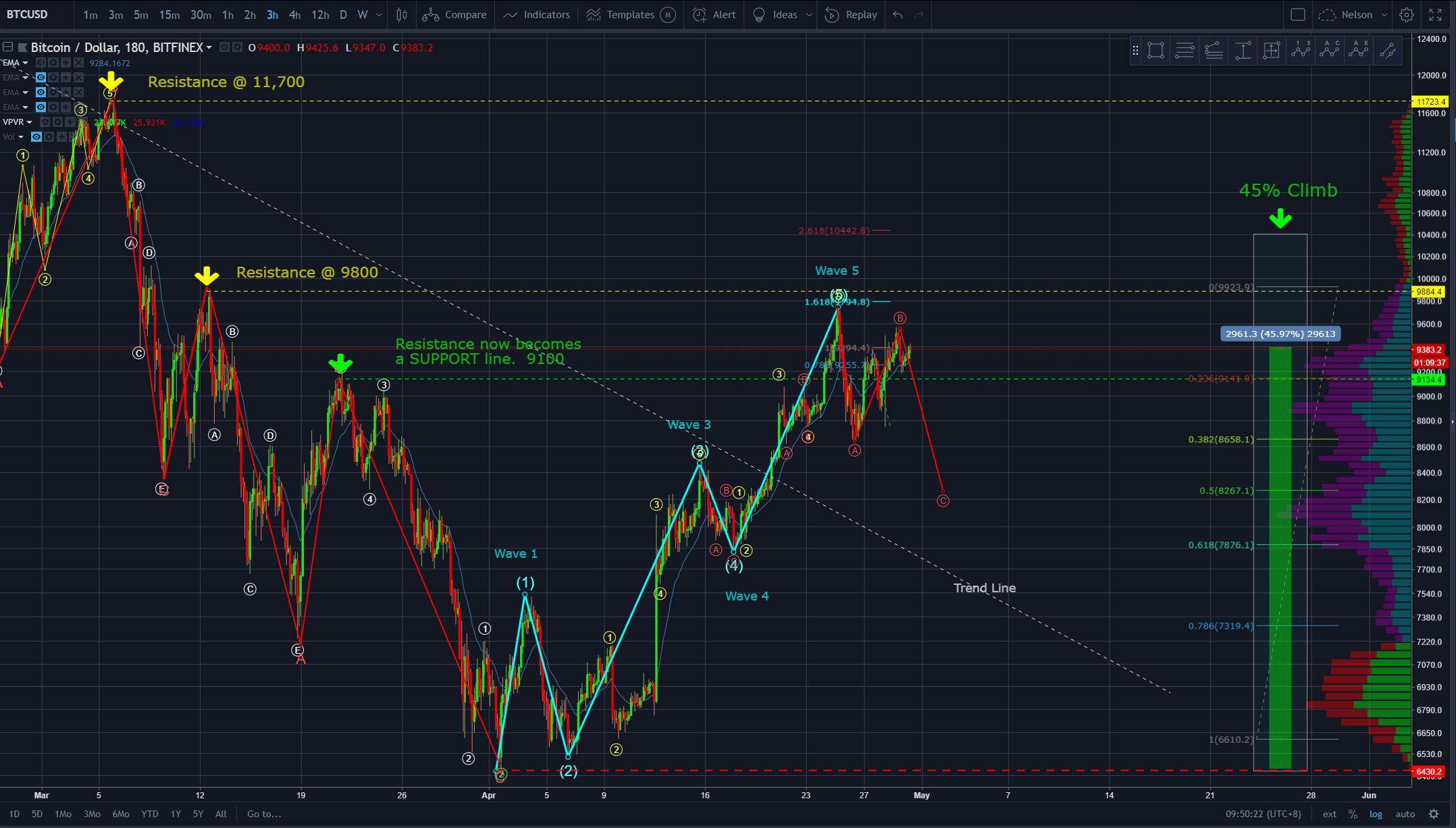BTC | USD Bitfinex | 3hr Chart | updated 10:00am