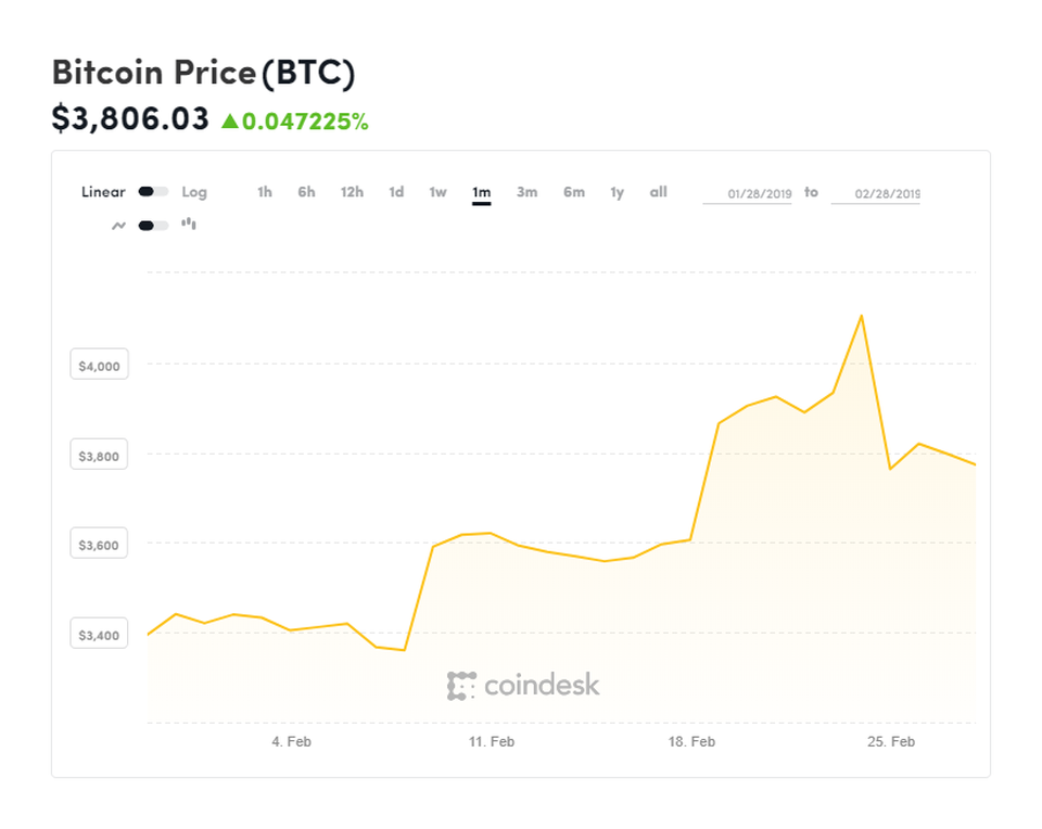 The bitcoin price, which began February at a little over $3,400 per bitcoin, has added some 11% over the month, climbing to $3,800. The bitcoin price briefly flirted with $4,000 per bitcoin a number of times during February but failed to secure a footing.