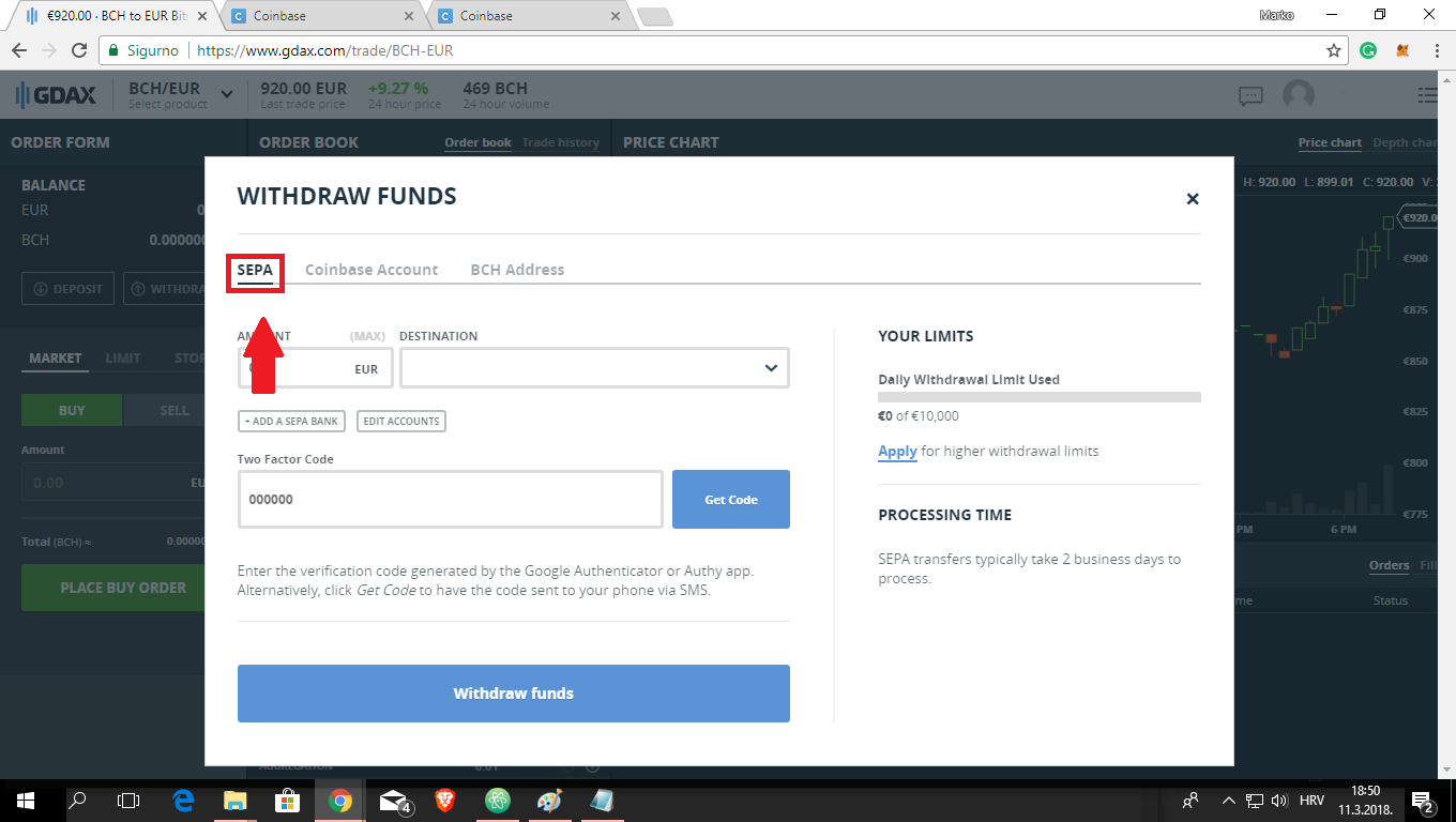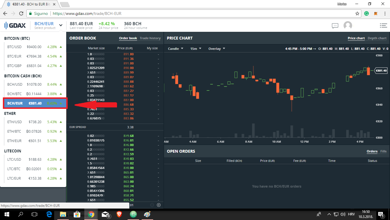 U padajućem izborniku odaberite par BCH/EUR (Bitcoin Cash/ Euro) zato što je u ovom trenutku transfer Bitcoin Casha najjeftiniji u odnosu na transfer drugih kriptovaluta, naravno - ako vam iz nekog razloga više odgovara da prebacujete neku drugu kriptovalutu na GDAX možete to napraviti. NAPOMENA: Bitcoin Cash nije isto što i bitcoin, Bitcoin Cash je "fork" bitcoina koji donosi neka poboljšanja kao što su veći "blokovi" od 8 MB nasuprot 1 MB kod običnog bitcoina što omogućuje brže i jeftinije transakcije.