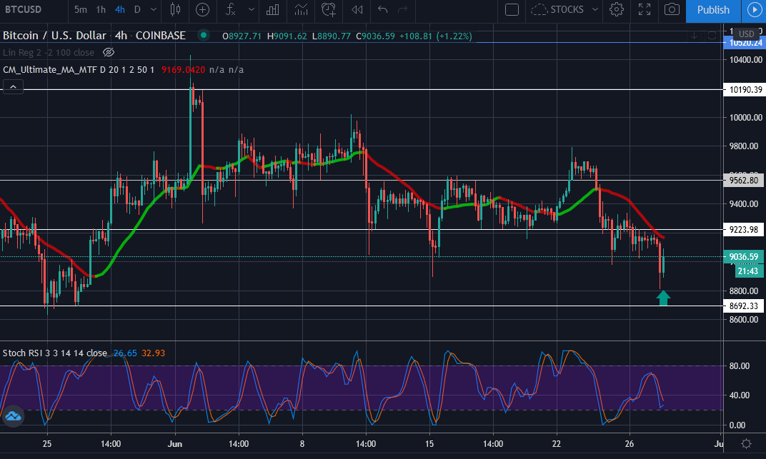 Bitcoin for Late 27 June, continue to show some negativity around the general sentiment for price action. It shows that it's having support around 8800 and 8700 levels that was previously on 25 May,
