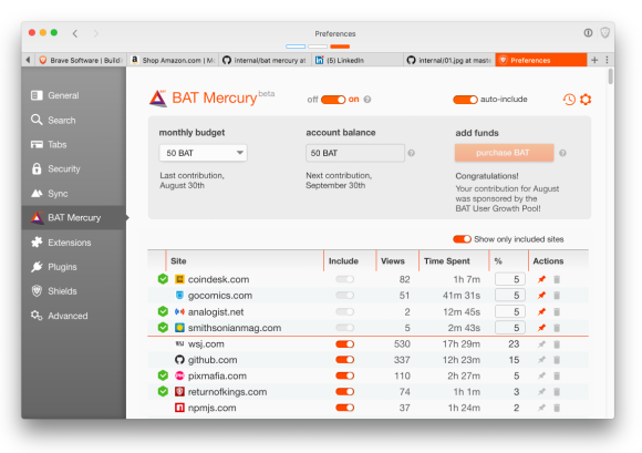 지금까지는 비트코인을 지불 수단으로써 이용했는데, Mercury 업데이트 이후로는 BAT를 사용하게 됩니다.
