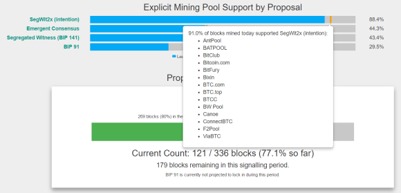 그러나 현재 BIP-91에 대한 지지도는 75%가량입니다. NYA(New York Agreement)에 대한 지지도가 90%를 넘어갔던 반면, 현재 몇몇 마이닝풀들이 BIP-91 신호를 발신하고 있지 않습니다.