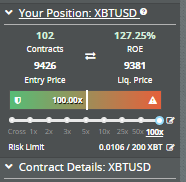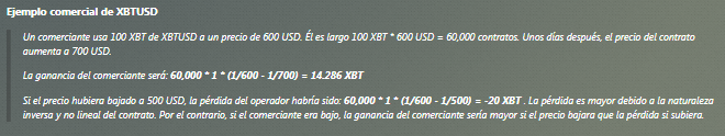 Un comerciante usa 100 XBT de XBTUSD a un precio de 600 USD. Él es largo 100 XBT * 600 USD = 60,000 contratos. Unos días después, el precio del contrato aumenta a 700 USD.