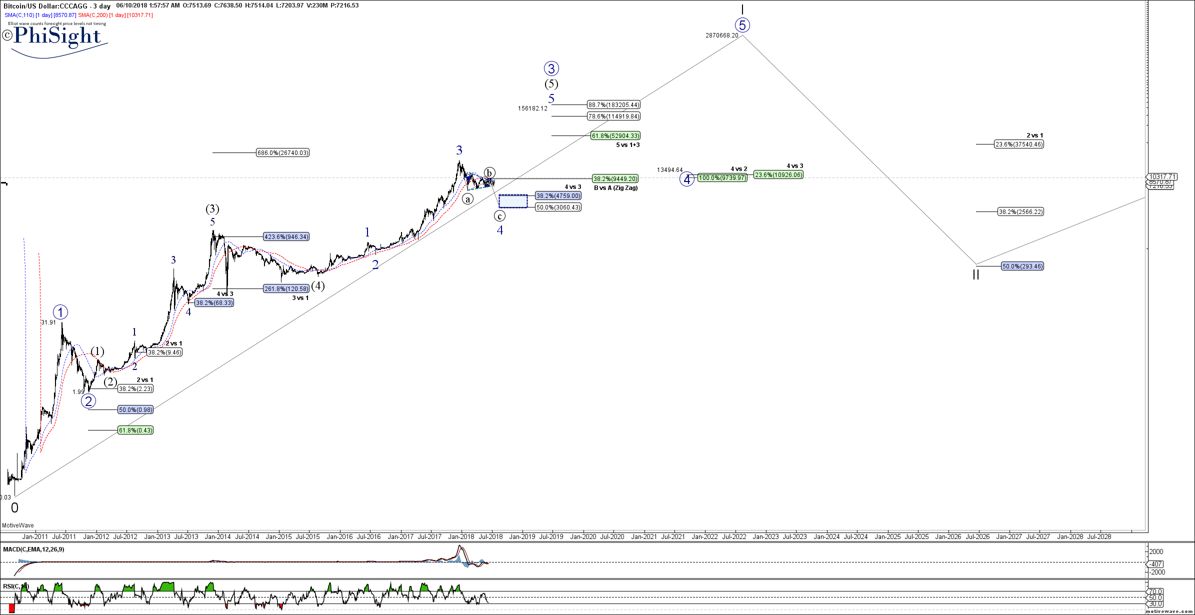 June 10, 2018: Here is a LONG TERM chart....predictions based on EWT are to be taken with a large spoon of salt due to the fractal nature of price, as the patterns can morph and change over time. Also, the levels are "as they seem at this time" based on standard expectations with some guess work. However, with that said, at this time, it can be posited that BTCUSD may be likely to target ~150k before correcting back to ~10k, then resurrecting a slingshot to ~2.8 million and then crashing back to ~290. These levels are not to be taken literally, as you know!