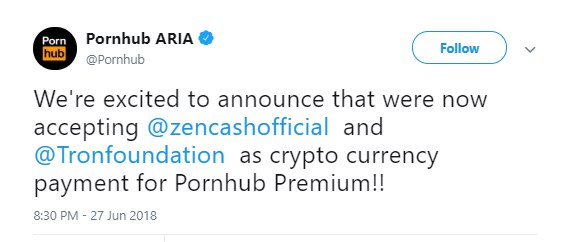Crypto now in Pornpinder12 (25)in #bitcoin • 8 years ago #ZEN (ZenCash) & #TRX (TRON) Both are Now Accepted on PornHub as Payment #porn #alts #icos #zen