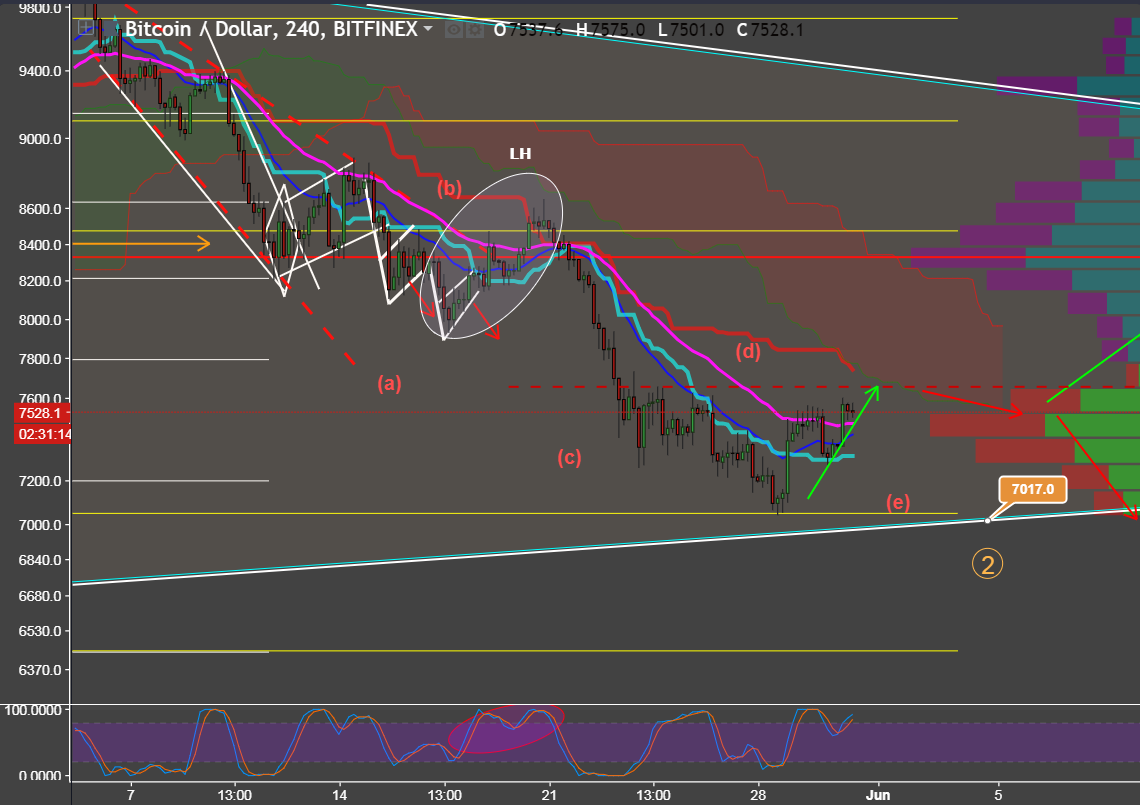We've got the 4h chart of BTC on Bitfinex exchange. There's a lot of things happening in the chart so let me break it down one by one. Something easily visible on the chart is the volume profile of visible range (vpvr) on the right. There were a few people trying out this indicator so I thought I'd give it a shot. Essentially it shows the buy volume (green and blue) and sell volume (red and purple) in a given range of price. As you can see the sell volume has been quite high in the current $7400-7600 range. This indicates that there are a lot of sellers and they outweigh the buyers. Working through this range is going to be tough so we will need strong bullish volume to surpass it. In addition, we face a resistance level from the previous support at the dashed red line. This is around the $7700 area. On top of that we will be facing heavy resistance with the Ichimoku cloud and the Kijun-sen line (red) around the $7700-7800 zone. The 40 EMA (pink) has still not crossed under the 20 EMA (blue) to give us a bullish cross signal. This is indicative of an environment that isn't truly bullish. As mentioned before this cross on multiple time frames (1h, 4h, and 6h) produces a strong buy signal. We are not there, yet. I'd like to direct your attention to the two ellipses in the price action and the stoch rsi (bottom of the chart). This matches the current movement of price action as our stoch rsi is quite high (overbought). So if the previous ellipses says anything of what lies ahead, we could expect further downside. If you are trading BTC I'd advise you to set a tight SL or a looser one at the tekan-sen line (light blue) around the $7306 marker.