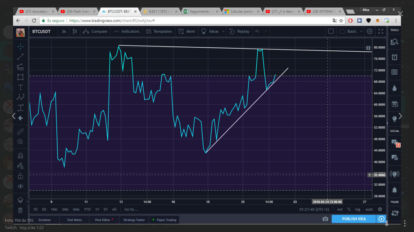 El precio sigue subiendo, en las ultimas 4 velas hemos tenido al precio en velas verdes, pero con grandes mechas y el volumen ha ido decreciendo bastante, hemos de tener cuidado ya que se esta formando una cuña descendente