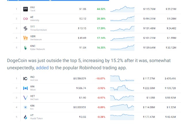 The gainers list was easily topped by PAY, the token issued by the crypto card startup TenX. As far as we know, there were no major events or news that could be linked to the 44 % spike. Aeternity (AE), Timesfarmtoken (TFT), Veritaseum (VERI) and Kyber Network (KNC) followed with gains between 16% and 20%.