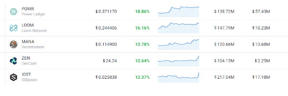 POWR, the token issued by Australian startup Power Ledger, has been on a roll recently, and it is sitting on top of the top gainers list with an 18.8% increase. Loom Network (LOOM) came close, gaining 16% in the last 24 hours.