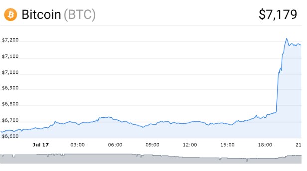 Today, the cryptocurrency market has seen a sudden spike reminiscent of what happened earlier in the year on April 12. Then, BTC jumped from $6,850 all the way up to $7,750 in the space of about an hour. Today, the resistance at $6,800 that proved too much for Bitcoin in its last two attempts was left in the dust by a spike from $6,750 to about $7,200, where Bitcoin appears to have cooled off (at least temporarily).