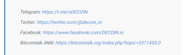If you want to stay in touch with the project’s latest developments, you can follow DECOIN on the following social media channels: