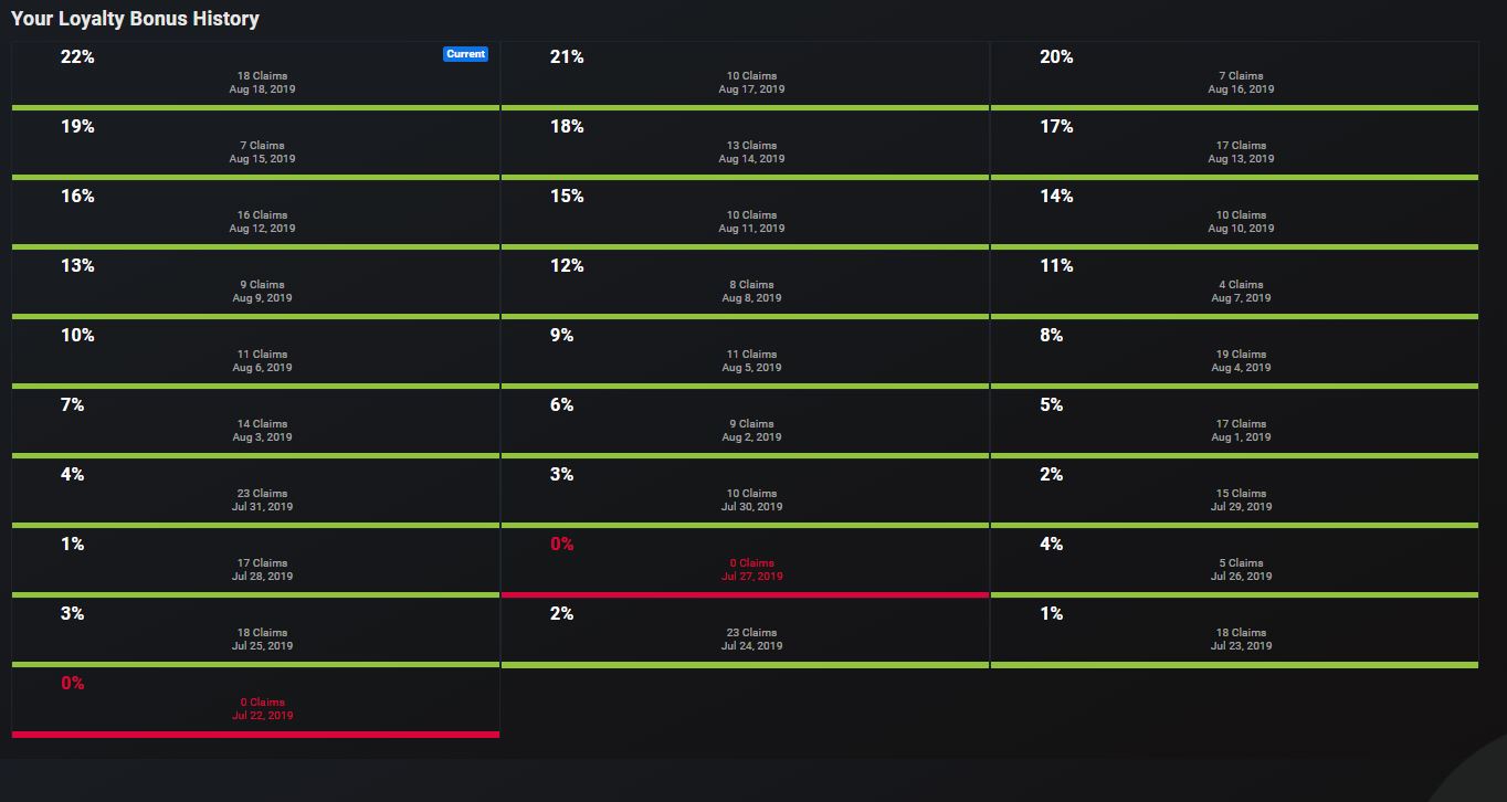 There is also fantastic loyalty bonus attached to each Cointiply account. The loyalty program adds a percentage to your earnings that increases by the number of days you visit Cointiply in a row. Below is my current loyalty bonus... As you can see I am at 22% because I visited the site 22 days in a row. This loyalty bonus continues to increase each day.