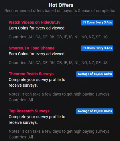 Cointiply also have a section that lists the top offers at any one time to increase your earning potential.