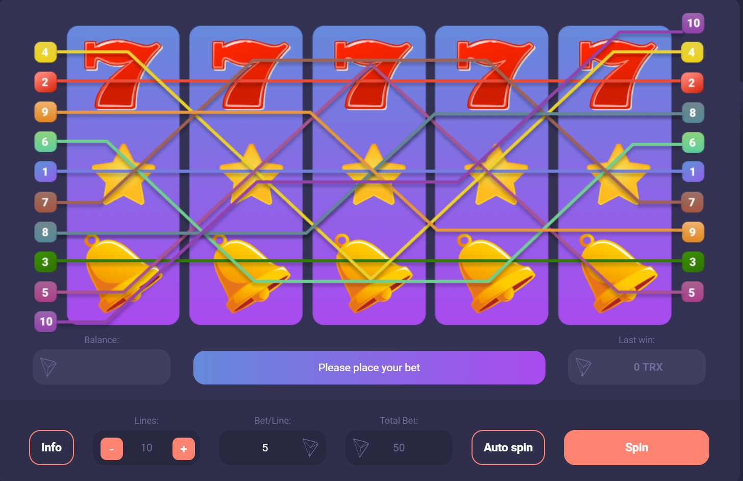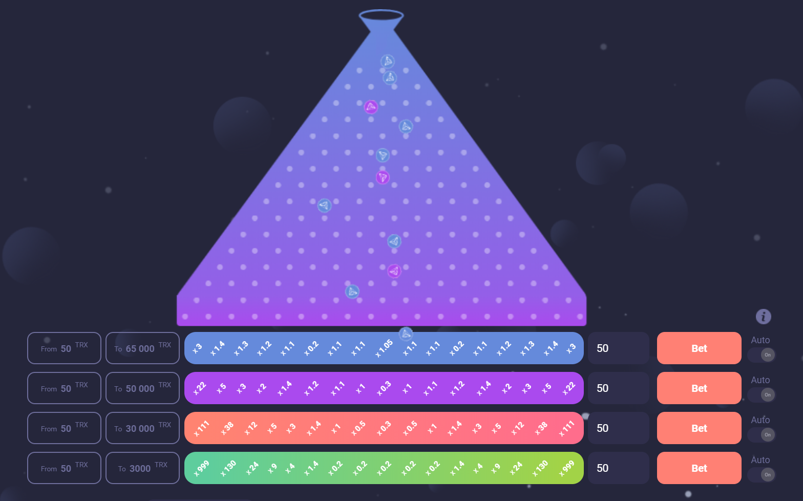 Minimum bet is 50 tron. The Lucky Tron game consists of a funnel, according to which your bet will fall in a form of a ball and depending on the color you bet you will receive your winnings.