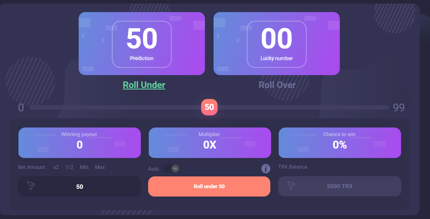 Minimum bet is 50 tron and you can select if the next number will be over or under your selection.