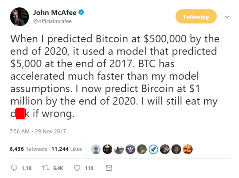 Anyway, in 2017, MacAfee said that Bitcoin would reach $500,000 in 2020, and if it didn’t, he would eat his private parts live on TV! If you didn’t think this was crazy enough, McAfee then increased his Bitcoin price prediction of 2020 to $1 million! To be honest, he seems rather confident to me.