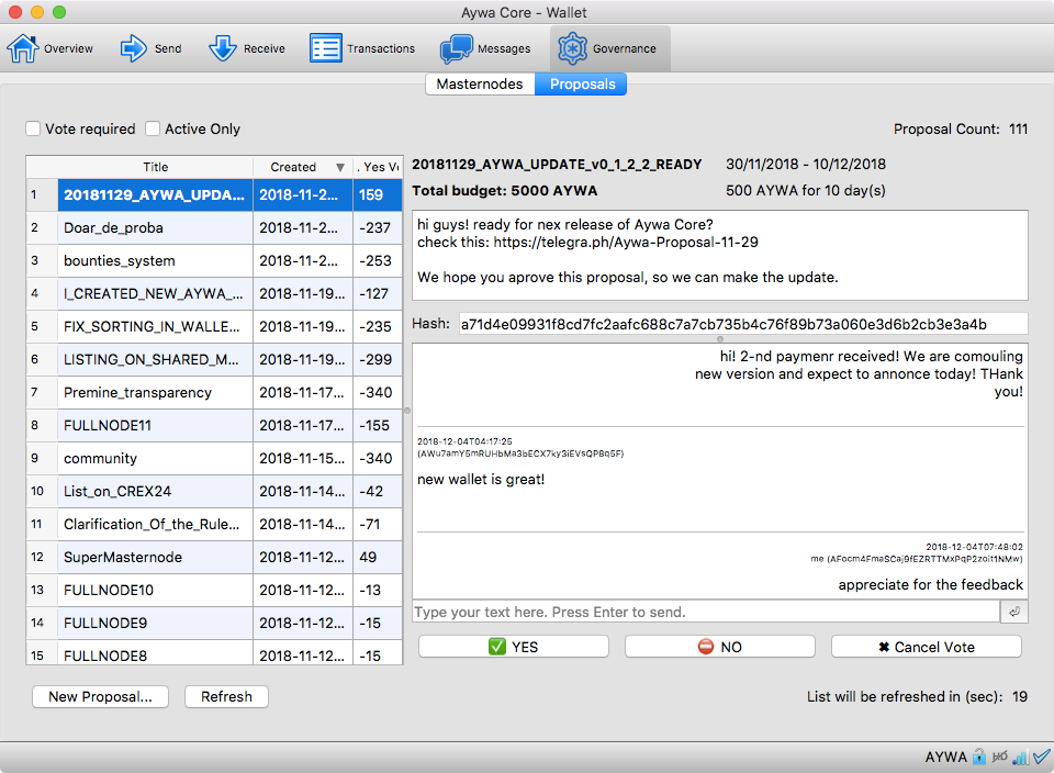 Send and receive messages after installation of AywaCore Wallet. Create your Public Channels or join any Proposal Channel to participate in a discussion. Please do review our white paper for more details.