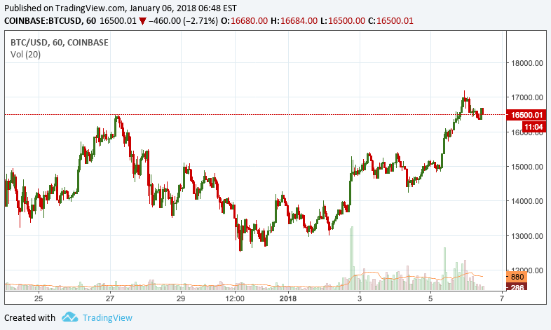 The hourly chart has rounded up to a successful cup advancing past the $16,500 resistance with ease. Possible support should be found at $15,900 or maybe as low as $15,000.