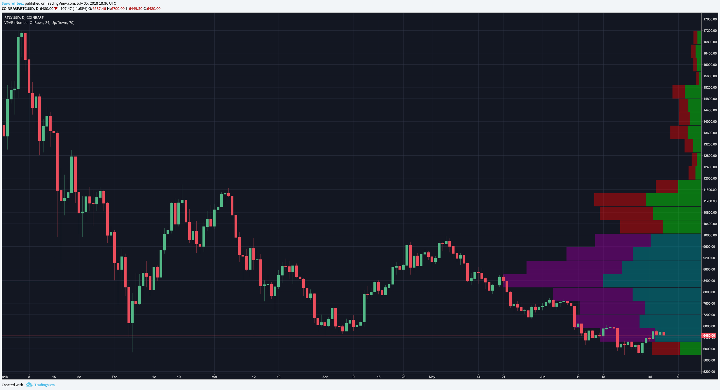 While I do believe that this rally has enough legs to get back to $7,770 - $8,150 there are two specific reasons that are making me hold off from opening a long. The first is the visible range volume profile which shows resistance stacked up from here to $8,500.