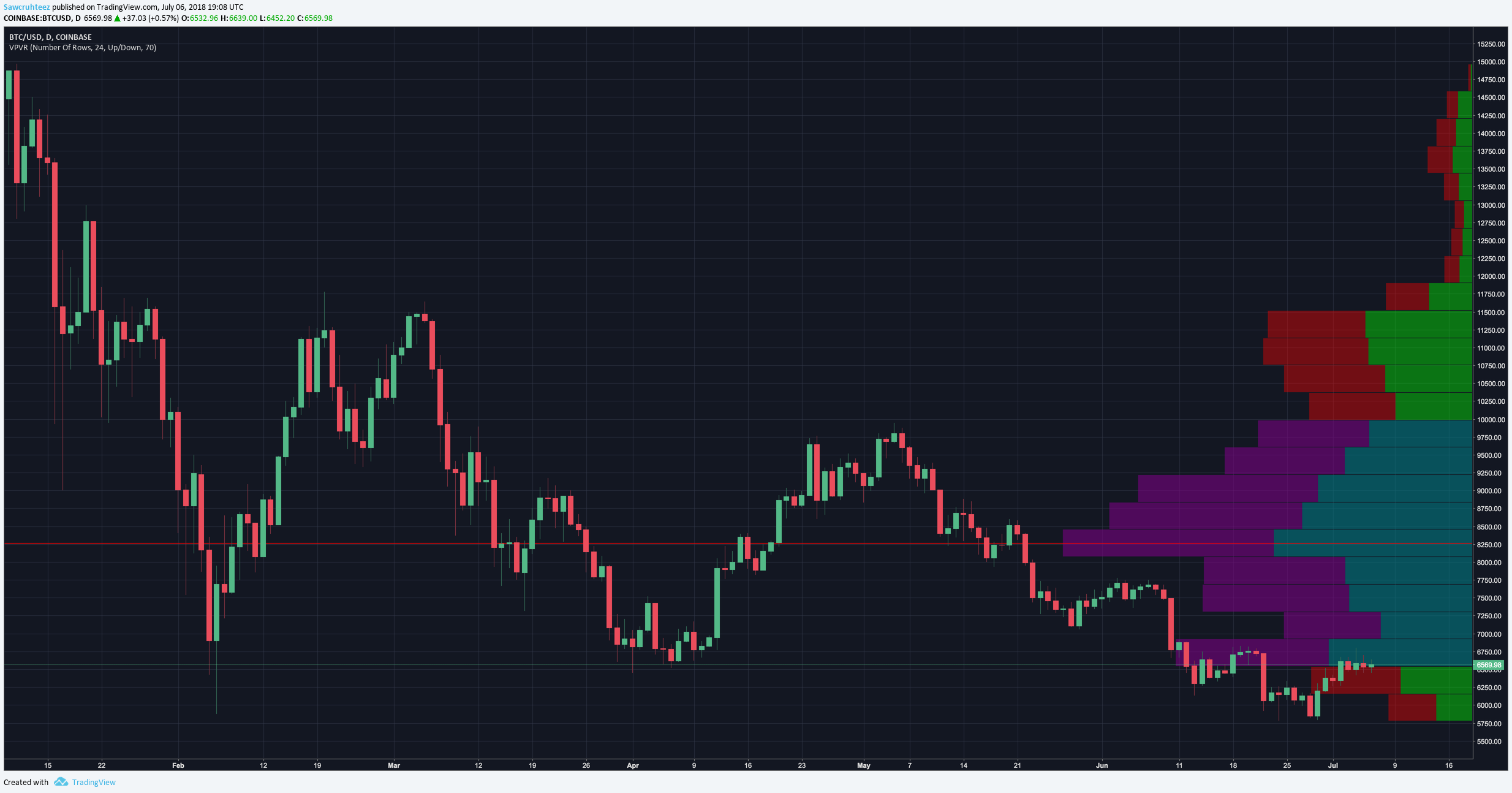 It is cut off in the picture but the next arrow was straight down to $5,000. The top of that channel is serving as strong resistance and it isn’t alone. There is established horizontal resistance from $6,750 - $6,792 and we can see that it is significant when looking at the visible range volume profile on the daily chart.