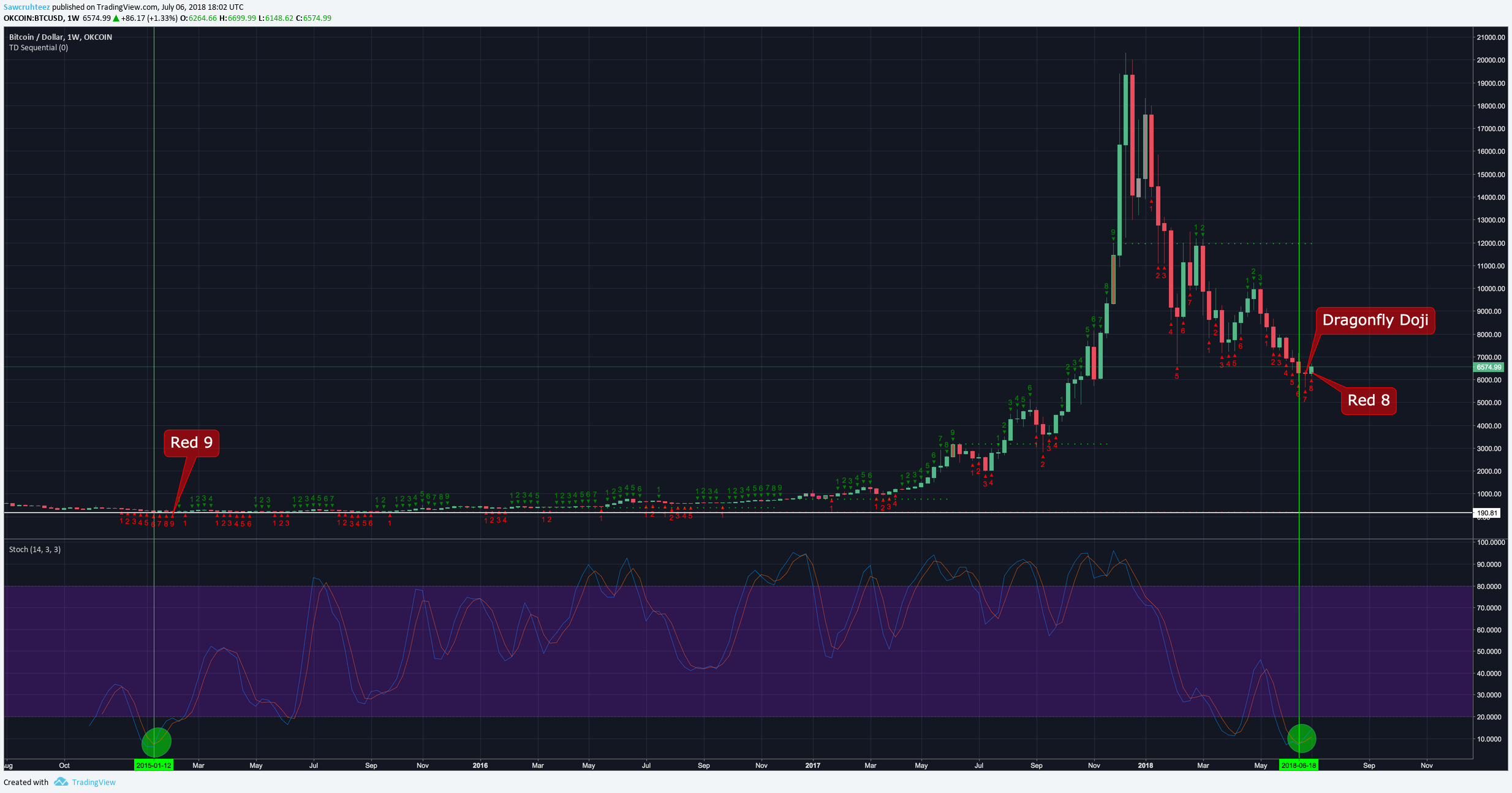 There are two indicators that signaled the bottom of the last bear market, prior to the year and a half of consolidation. It was a red 9 on the weekly TD sequential and and a cross on the weekly Stochastic below 12.