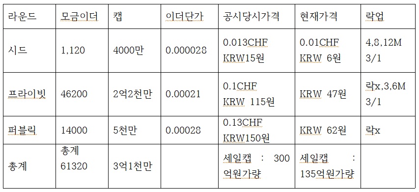그리고 초기 시드로 1120이더 받았습니다. 4천만개가 팔렸다는데 시드 단가는 지금 이더기준 0.01 스위스 프랑 한화 6원즘, 백서 작성 당시 0.03프랑, 한화 16원 가량입니다. 합니다. 락기간은 4개월 33%, 8개월 33%, 12개월 33%입니다. 이더로 따지면 90% 디스카운트 해준겁니다.