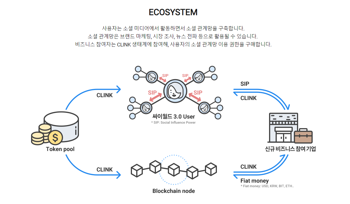 한마디로 그냥 싸이월드 SNS내에서 사용되는 코인이며 나중에 밖에서도 쓸수있게 Clink도 만든답니다.