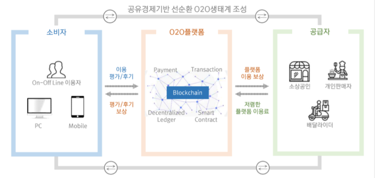 인을 연결하는 블록체인 서비스입니다. 간단하게 생각하면 우리는 어플로 음식, 마트에서 장보기 등을 주문을 하면 집으로 배달이 옵니다. 이것이 바로 O2O입니다.
