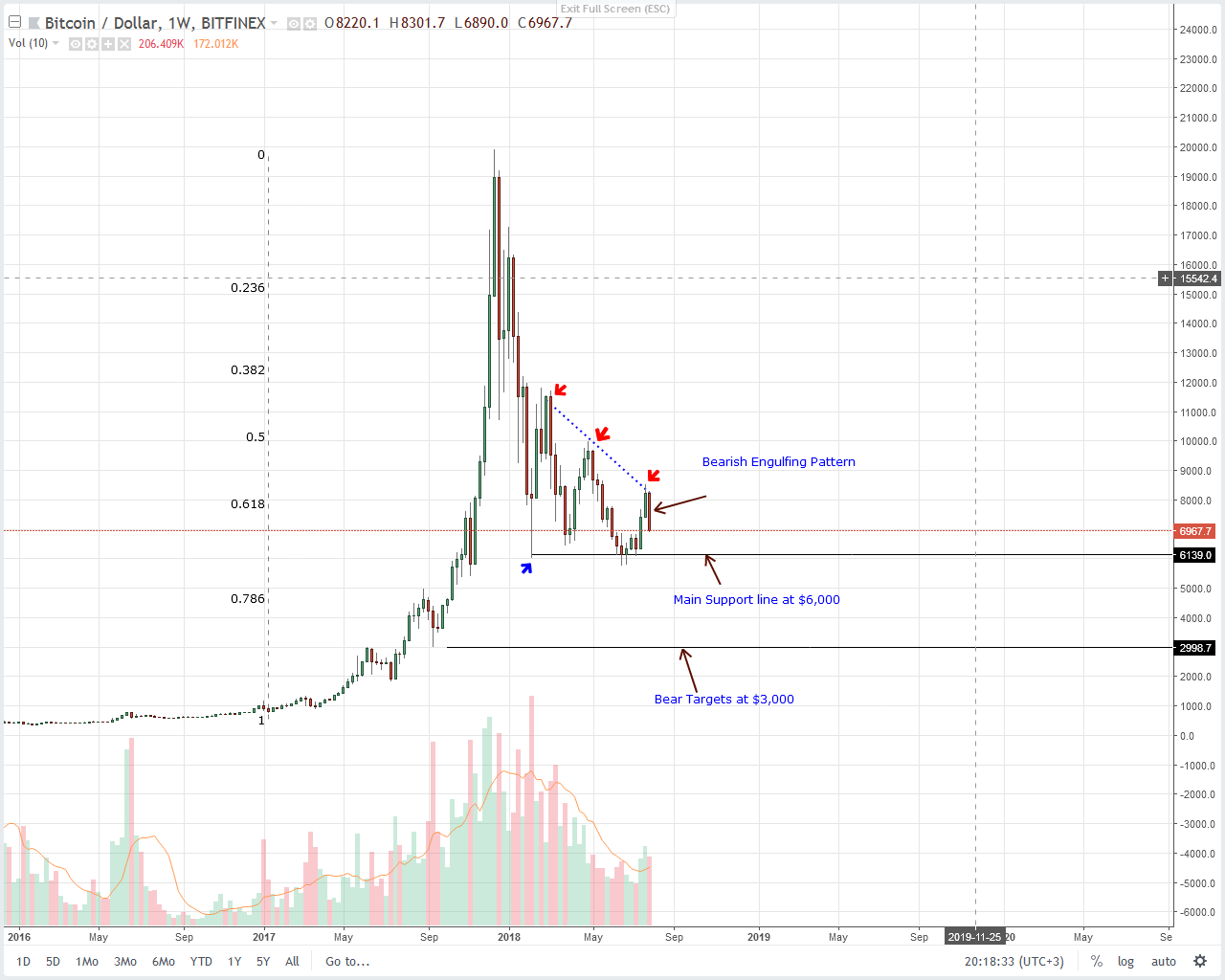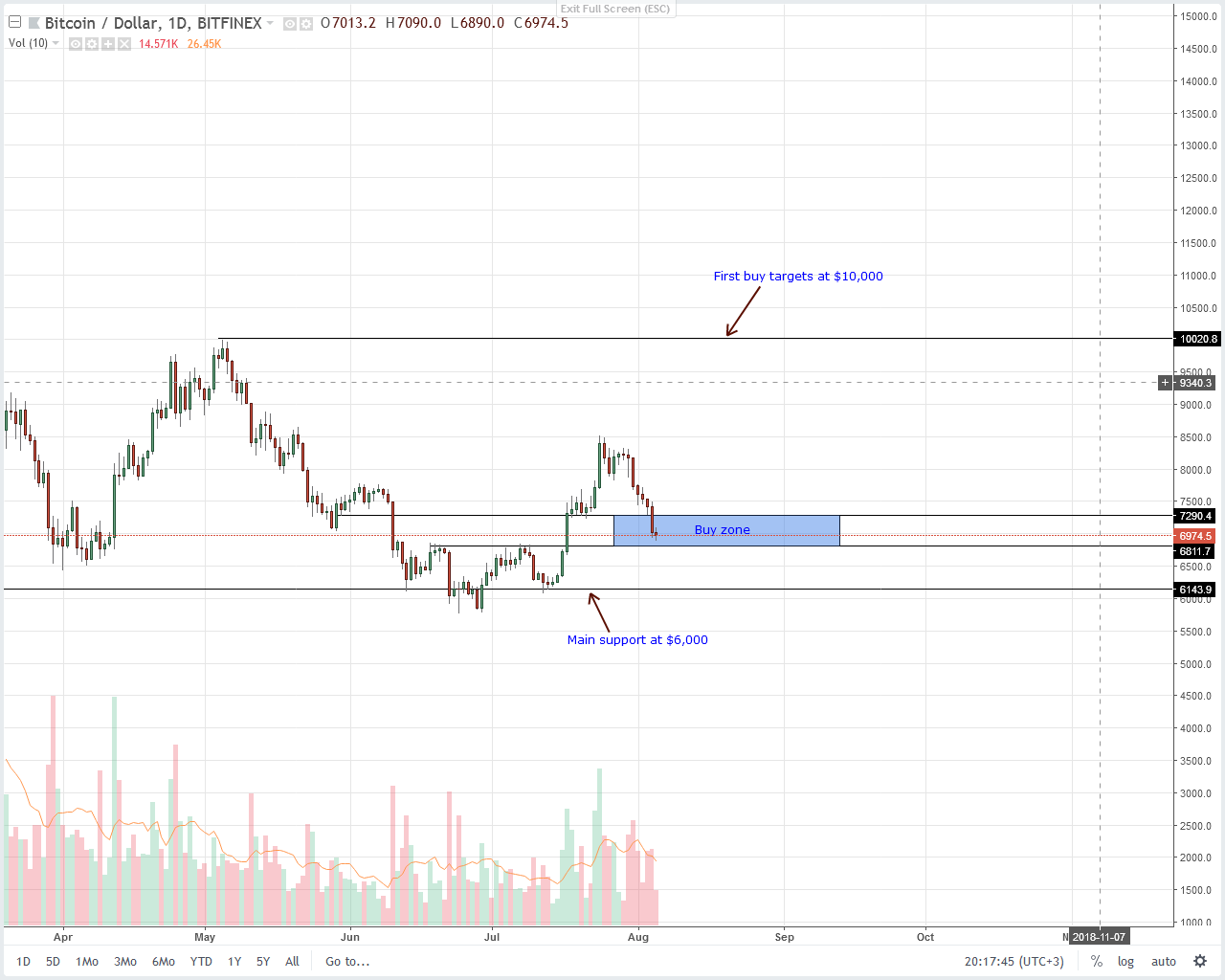 Now, as laid out in our last Bitcoin (BTC) analysis, we exited our longs with plans of purchasing anywhere between $6,800 and $7,200.