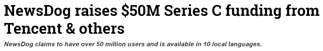 뉴스독은 중국 대기업 텐센트 (Tencent)가 이끄는 시리즈 C 펀딩 라운드에서 5 천만 달러를 모급하였습니다.