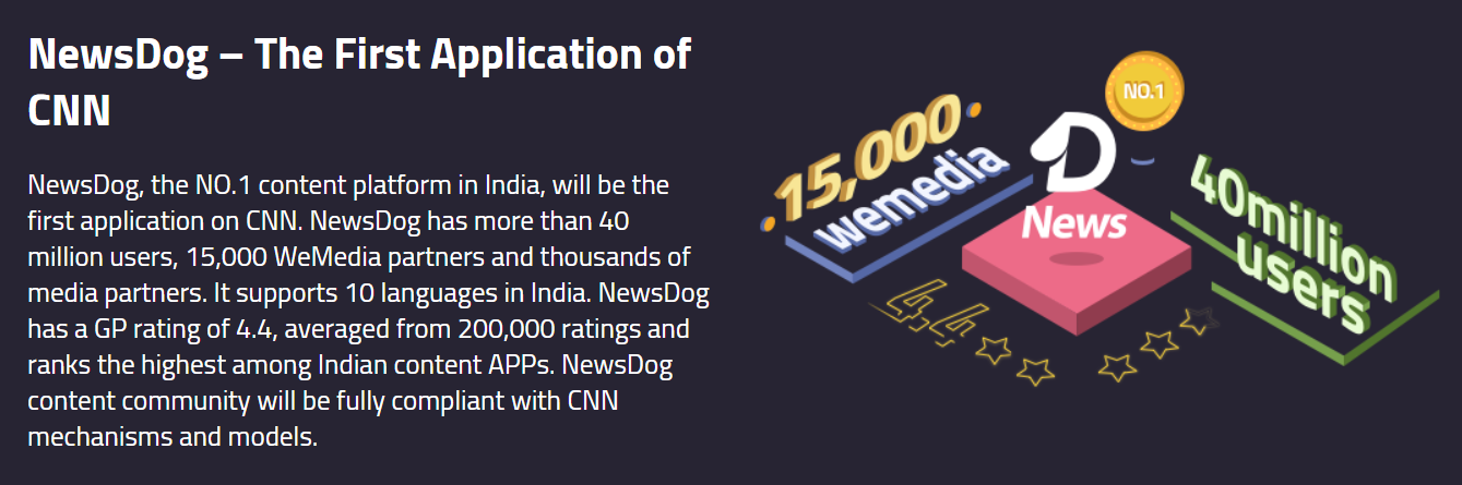 인도의 NO.1 콘텐츠 플랫폼 인 NewsDog가 CNN의 첫 번째 애플리케이션이 될 것입니다. NewsDog는 4 천만명 이상의 사용자, 15,000 명의 WeMedia 파트너 및 수천 명의 미디어 파트너를 보유하고 있습니다. 인도에서 10 개 언어를 지원합니다. NewsDog의 GP 평점은 4.4이며 평균 20 만 회의 평점을 받았으며 인도 콘텐츠 앱 중 가장 높은 순위를 차지했습니다. NewsDog 콘텐츠 커뮤니티는 CNN 메커니즘 및 모델을 완벽하게 준수합니다.