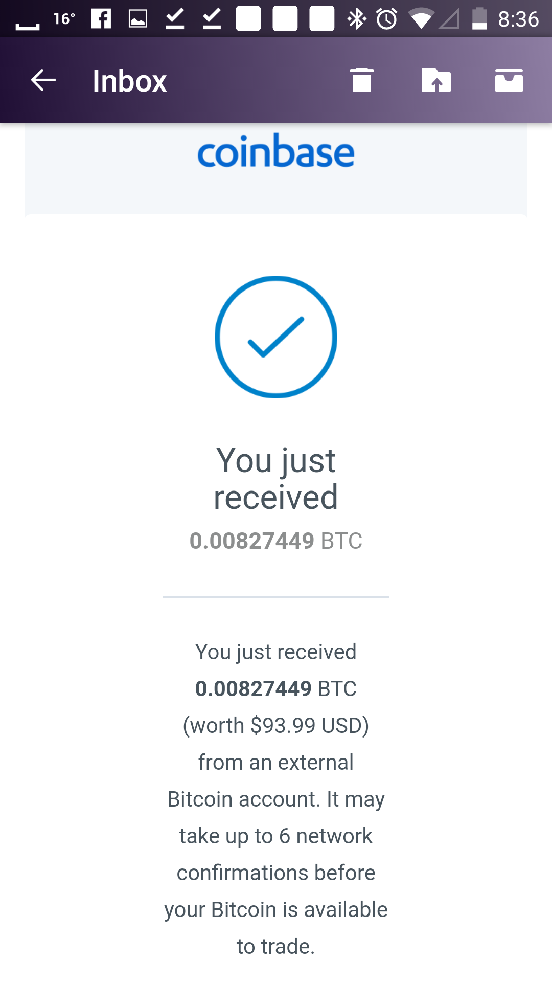 You will almost immediately get an email from coinbase acknowledging the transaction. It will take a little while for the true confirmation though.