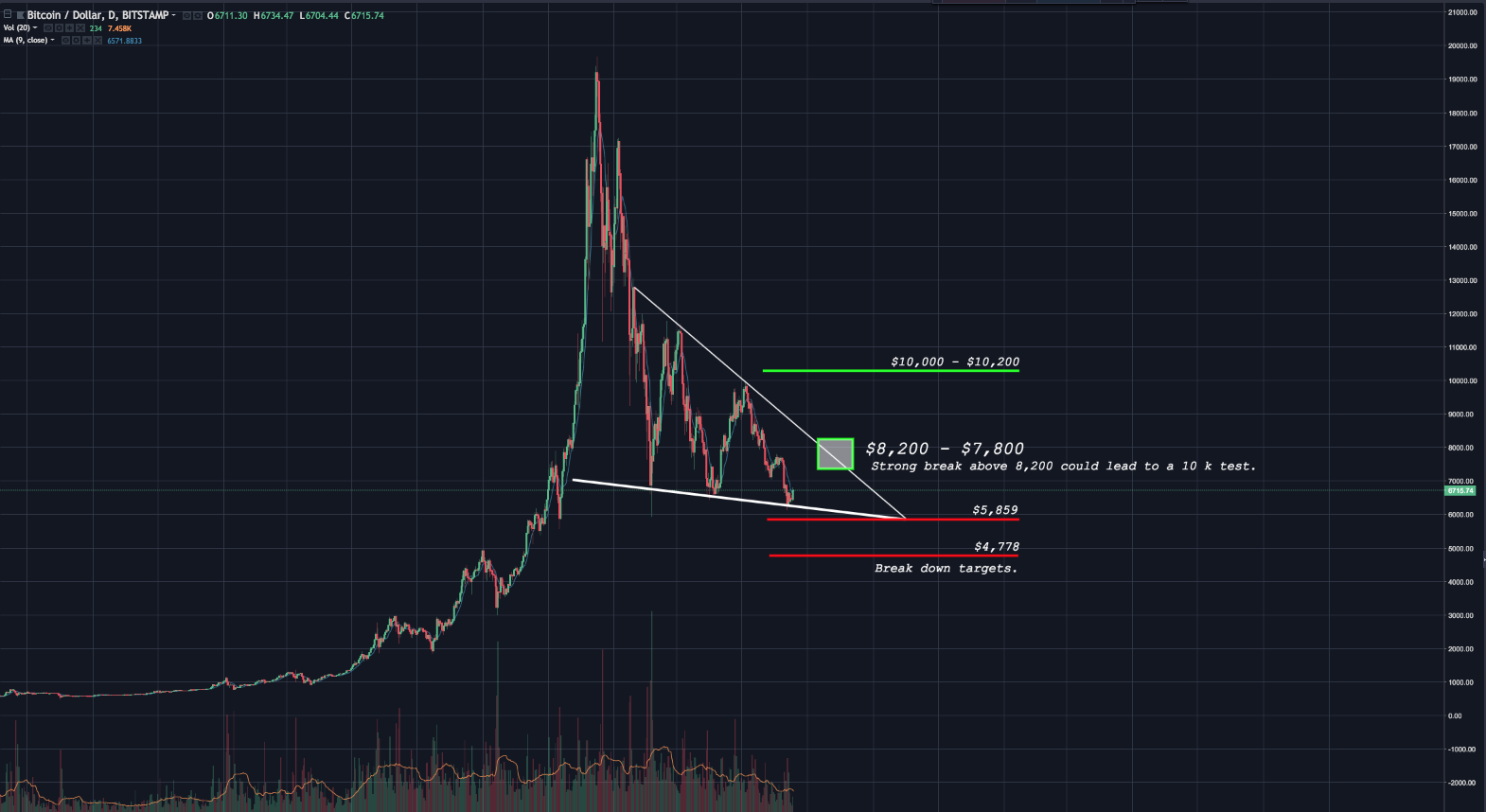 The daily MACD seems to be curling up, so a strong break above $7,100 could see us test the top trendline at the noted $8k regions.
