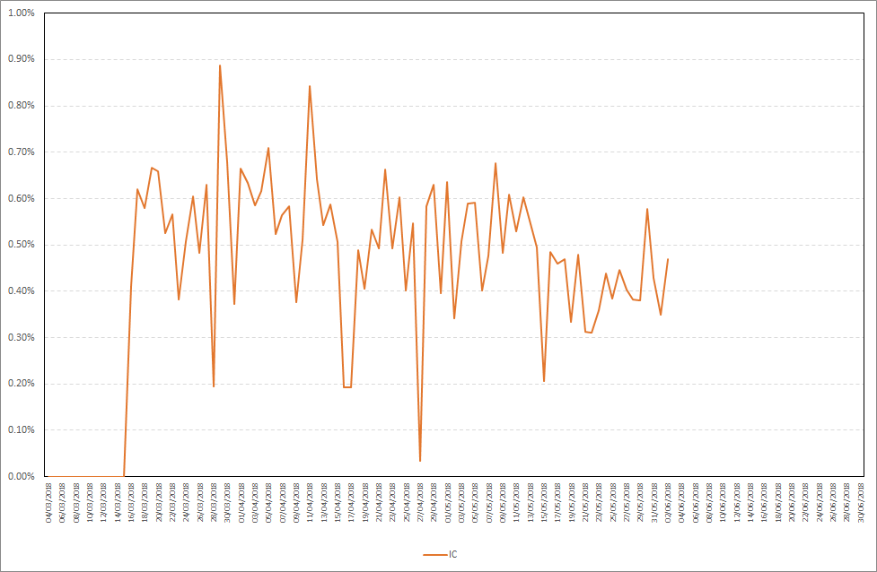 As you can see, IC starts staking almost three days after your stake is included in the wallet. Maximum daily stake profit in the period from 27.05.2018-02.06.2018 was 0,58%, while the average daily stake profit was 0,43%. This is still one of my favorite coins. Detailed results are presented on the chart below.