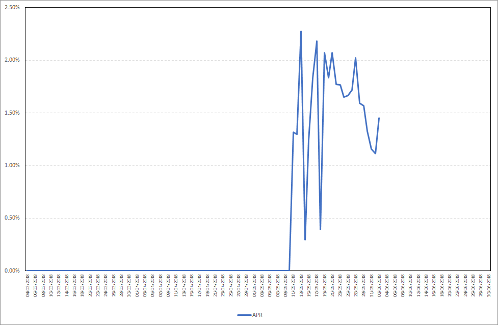 As you can see, APR starts staking almost immediately after your stake is included in the wallet. Maximum daily stake profit in the period from 27.05.2018-02.06.2018 was 2,02%, while the average daily stake profit was 1,46%. Detailed results are presented on the chart below.