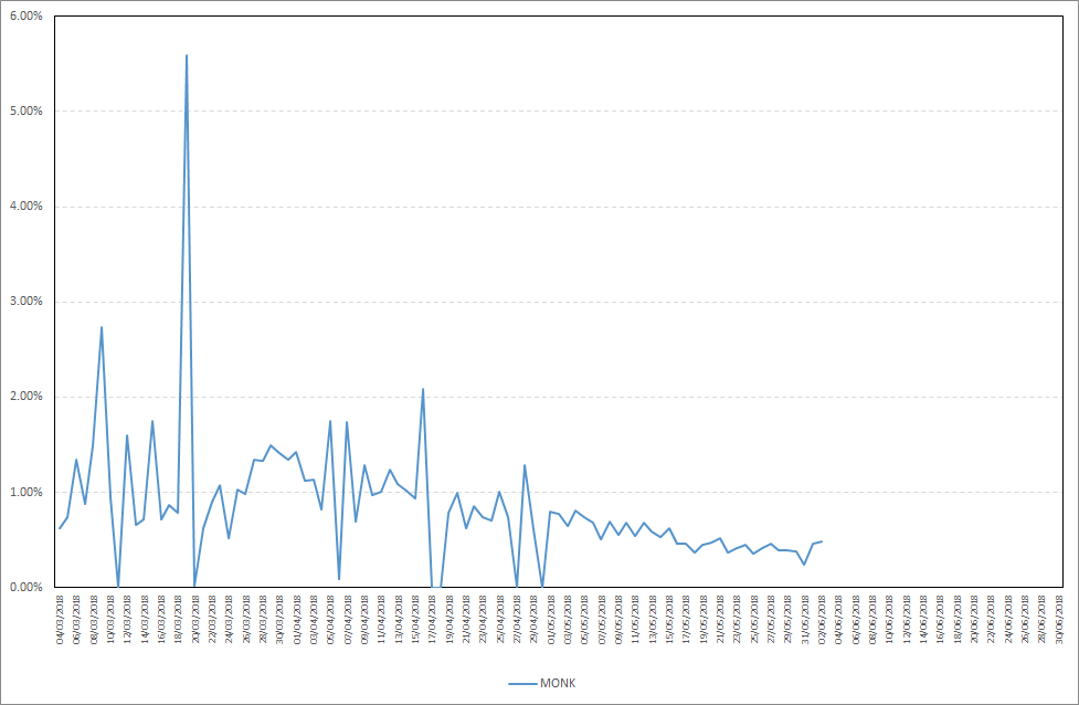 As you can see, MONK also starts staking almost immediately after your stake is included in the wallet during daily wallet maintenance. Maximum daily stake profit in the period from 27.05.2018-02.06.2018 was 0,49%, while the average daily stake profit was 0,40%. Detailed results are presented on the chart below.