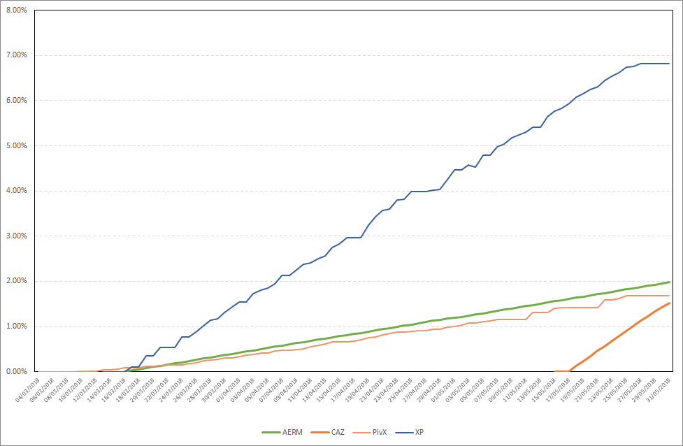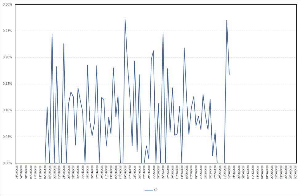 As you can see, XP took a while before giving a first stake, I was waiting for 4 days. Maximum daily stake profit in the period from 27.05.2018-02.06.2018 was 0,27%, while the average daily stake profit was 0,07%. Detailed results are presented on the chart below.