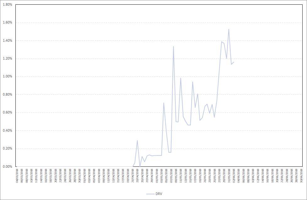 As you can see, DRV starts staking the next day after you deposit it. Maximum daily stake profit in the period from 27.05.2018-02.06.2018 was 1,53% , while the average daily stake profit was 1,27%. Detailed results are presented on the chart below. Hold on to your pants with DRV since it is nowhere close to the maximum ROI phase yet (10.000% is yet to come)!