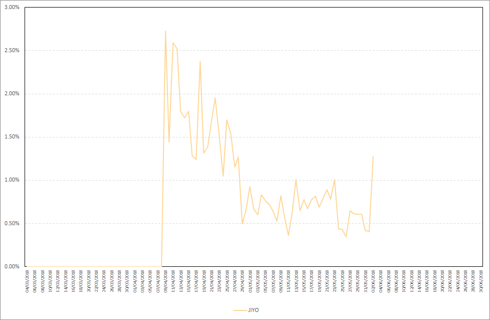 As you can see, JIYO starts staking almost two-three days after your stake is included in the wallet. Maximum daily stake profit in the period from 27.05.2018-02.06.2018 was 1,28%, while the average daily stake profit was 0,65%. Detailed results are presented on the chart below.