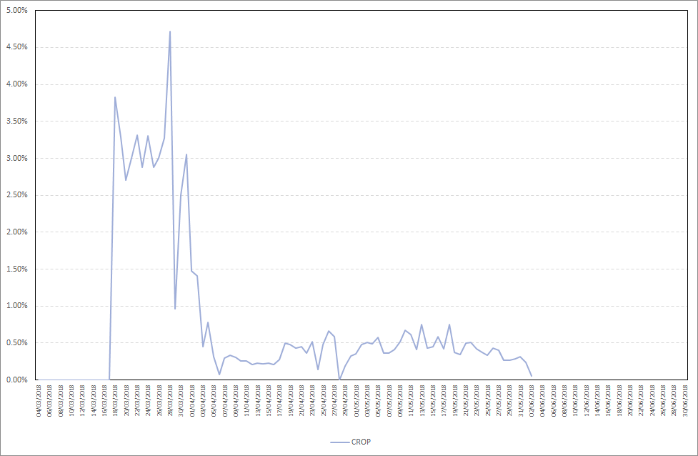 As you can see, CROP starts staking almost immediately after your stake is included in the wallet. Maximum daily stake profit in the period from 27.05.2018-02.06.2018 was 0,41%, while the average daily stake profit was 0,26%. Detailed results are presented on the chart below.