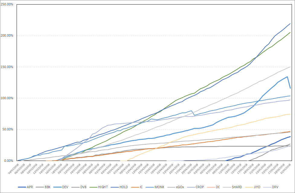 On 02.06.2018, my portfolio has slightly changed compared to the previous analysis (here). The coins included in the portfolio are: AERM (Aerium), APR (APR Coin), BBK (BitBlocks), CAZ (Caz coin), CROP (CropCoin), Ducat Coin (DC), DEV (Deviant Coin), DRV (Dravite), DV8 (DV8 coin), ENDO (Endocoin), HIGHT (High Coin), HOLD (Interstellar Holdings), IC (Ignition Coin), JIYO (JIYO), MONK (Monkey Project), OPC (OP Coin), PIVX, SHARD (Shard), XGOX and XP (Experience points).